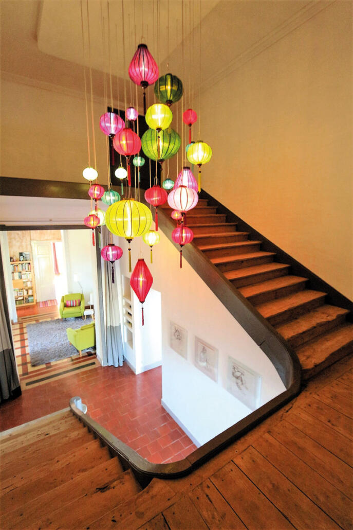 Cage d’escalier de la maison principale. 5,50m de hauteur sous plafond. Lampions en soie rapportés d’un voyage au Viêt-Nam et mis en scène par Dominique. Très légères variations lumineuses en intensité et couleur. Escalier d’origine. Marches en peuplier décapé. Première marche en pierre. Limon peint en gris. Sol de la cage d’escalier en tomettes de terre cuite. Ensemble splendide.