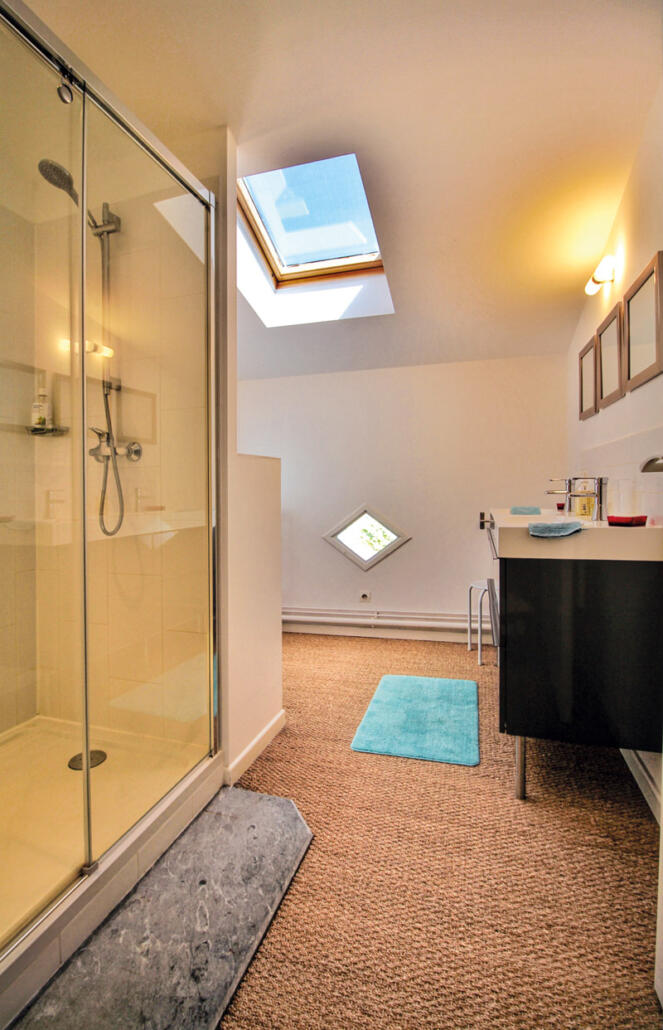 Salle de bains dans le gîte. Meuble vasque Ikea. Au sol, jonc de mer. Fenêtre de toit Velux.