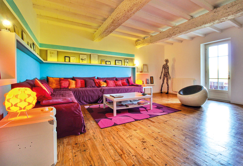 Salon dans le gîte. Parquet d’origine vitrifié. Murs, poutres et plafonds peints en blanc. Délimitation de l’espace canapé par une peinture bleue et des étagères qui accueillent une collection de dessins d’artistes. En guise de canapés, Isabelle a rassemblé des lits, recouverts d’une housse. Coussins confectionnés par un tapissier. Fauteuil Fly. Lampes orange Ikea. Sculpture « humaine » de Yod.