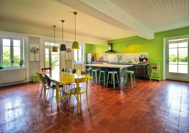 Dans le gîte : cuisine et salle à manger. Cuisine Ikea, spots encastrés au-dessus de l’îlot, plan de travail conçu par le menuisier Dazéas. Tabourets Maisons du Monde, réplique des tabourets Tolix. La table de la salle à manger est une table de famille customisée, entourée de chaises de récupération et de chaises La Redoute. Suspensions Castorama. Peintures verte et grise réalisées par le peintre Gilles Frument, Isabelle a peint le reste de la pièce en blanc. Au sol, tomettes d’origine. Les tableaux sont de Duke.