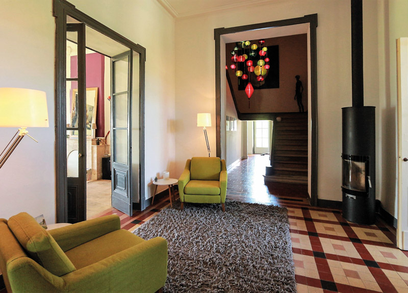 Hall de la maison principale. 3,70m de hauteur sous plafond. Poêle Pilar de marque Attika (8kW). Fauteuils Maisons du Monde. Au sol, carreaux d’origine.