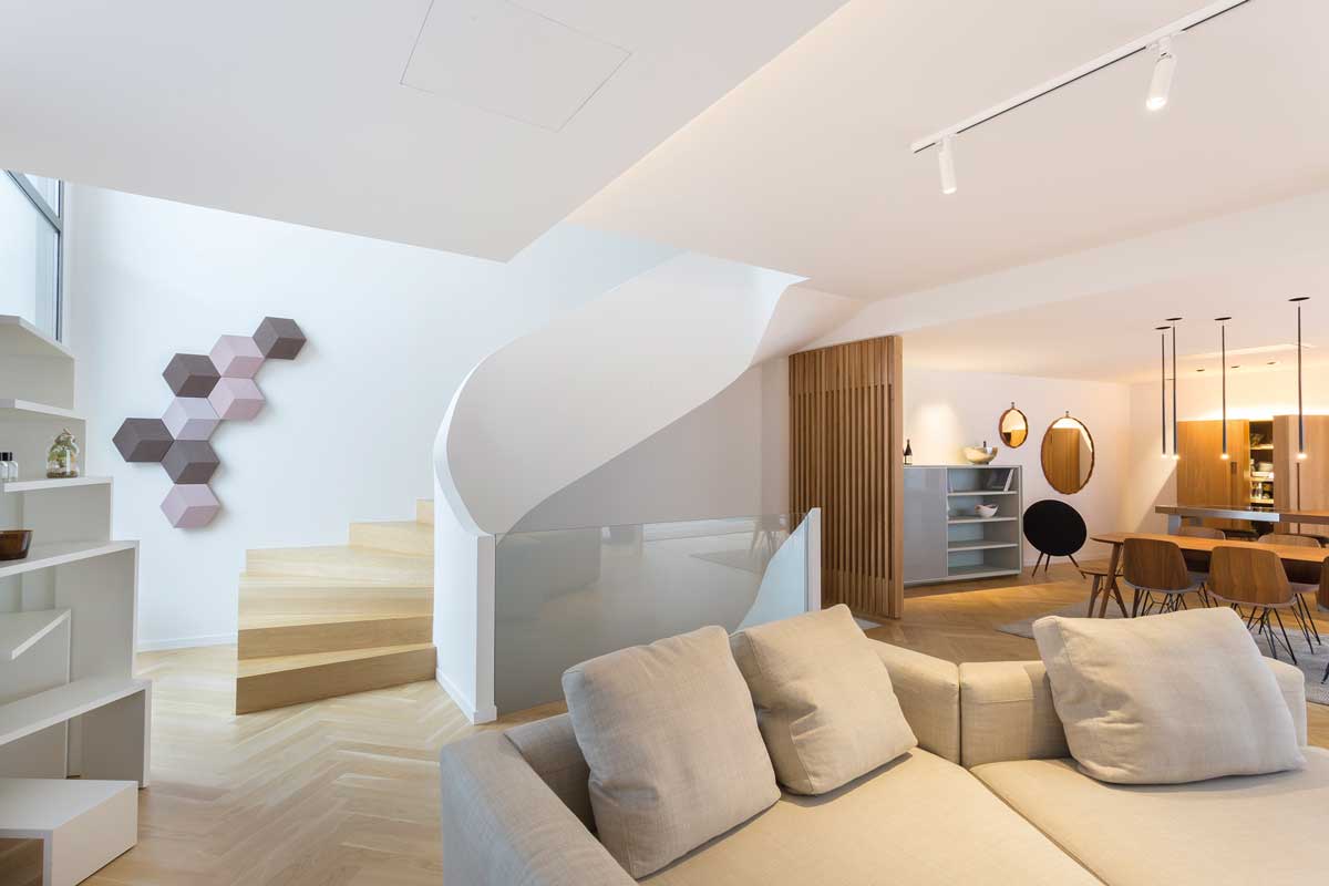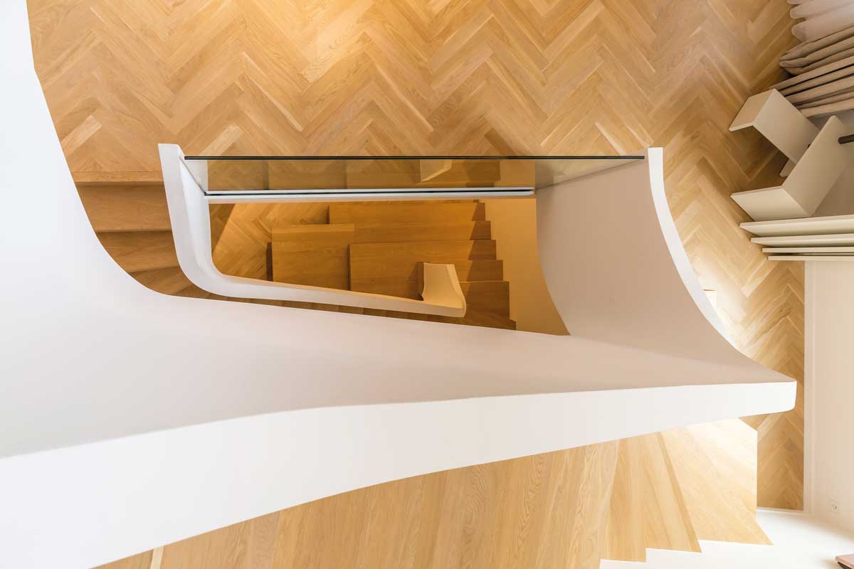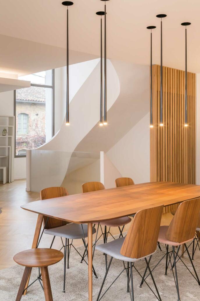 La colonne vertébrale du projet est l’escalier en voile béton réalisé par Scal'in (Toulouse). Il traverse de haut en bas l’édifice. Sur le palier du premier étage, le garde-corps en verre permet de profiter du lustre magistral.
