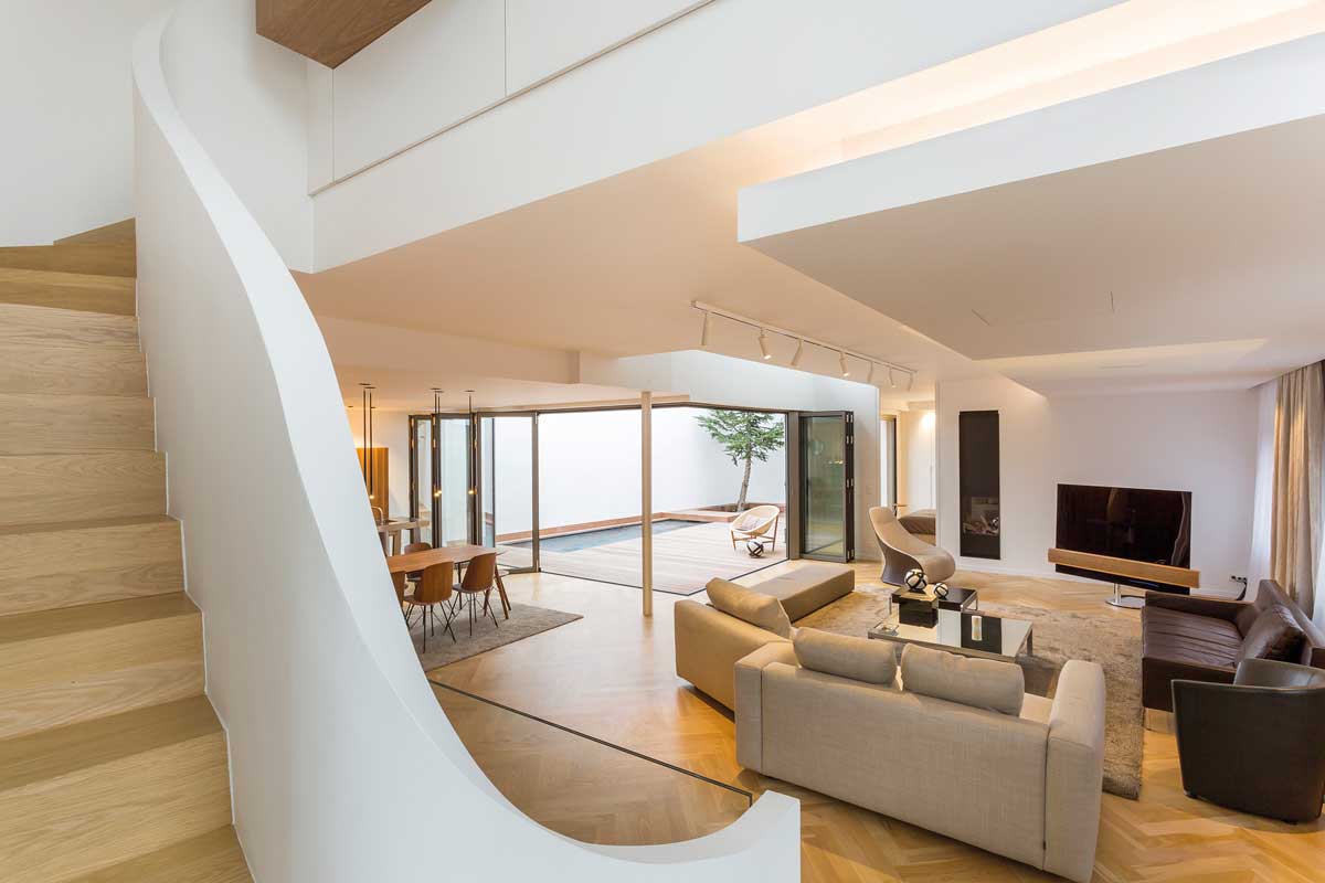 Livrée en juillet 2018, après 14 mois de chantier et l’intervention d’une vingtaine d’entreprises, l’habitation de Corinne et Thomas compte trois niveaux. Au rez-de-chaussée : l’entrée et l’escalier, le garage, la salle de gym, le bureau, la buanderie. Au premier : les pièces à vivre, la suite parentale, le patio avec piscine. Au second : trois chambres avec salle de bains. Le projet se développe à grande échelle. « Ses dimensions sont démesurées mais ramenées au volume, elles restent à proportion. » 250 m2 de surface habitable, une pièce à vivre de 90 m2, des menuiseries en accordéon de 14 m de long, une baie fixe de 6 m de haut dans l’escalier, une terrasse de 50 m2, une jardinière de 3 m de côté pour accueillir un cèdre du Liban, une piscine… Pour autant, aucun élément technique n’est visible. Rien ne perturbe la lisibilité fluide de l’espace. Évidemment, la tenue d’un tel projet ne va pas sans une relation solide avec « des clients à l’écoute et de bon goût ».