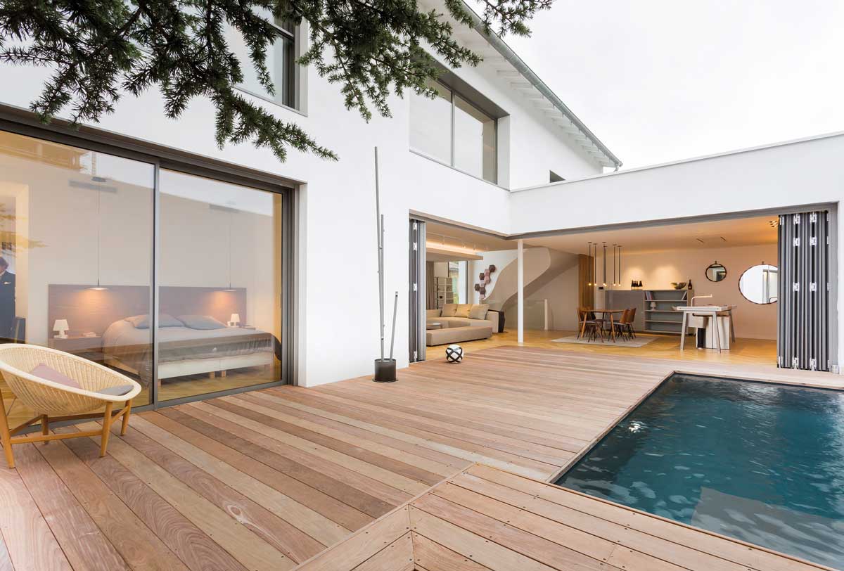 « Nous avons ouvert les toitures, explique Jérôme Méric, pour créer cette terrasse avec piscine. » Terrasse en ipé posée par Stéphane Tettamanzi (Toulouse). Piscine sur-mesure de forme trapézoïdale (pour suivre le mur) de 5-6 m de long par 2,50-1,60 m de large, réalisée par Piscinéa (Labège).