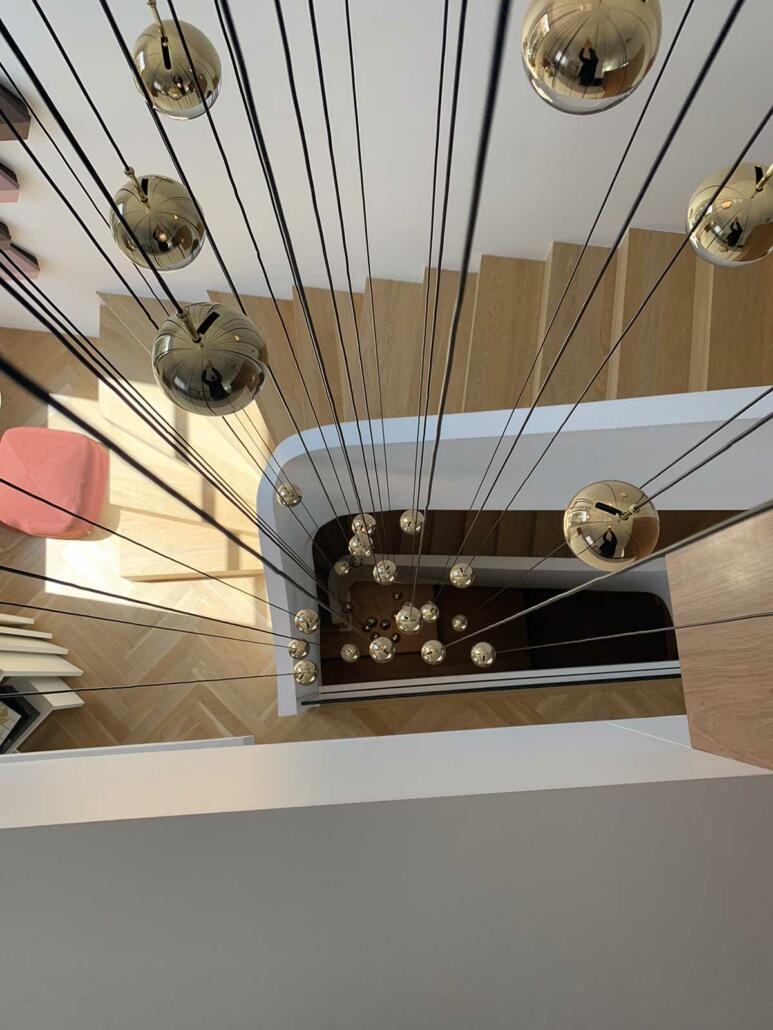 Le luminaire de 36 sphères en verre loupe et laiton créé sur-mesure est la dernière pièce à avoir rejoint l’habitation. Une véritable œuvre d’art tout en légèreté.
