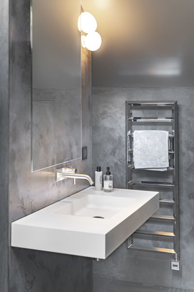 Dans la salle de bains, aux murs : enduit béton (peintre Corin’s Manufaktura). Robinetterie et vasque Partedis (Toulouse Lardenne).