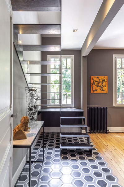 Le sol de la cage d’escalier, ancienne salle de bains, est aujourd’hui recouvert de véritables carreaux de ciment (Ateliers Zelij, Toulouse). Les murs marrons de la salle à manger se prolongent dans la cage d’escalier pour agrandir l’espace, tout comme le beige grisé du couloir. Peintures Unikalo (chez Nuances et Décoration à Toulouse). Peintre : Corin’s Manufaktura (Toulouse).