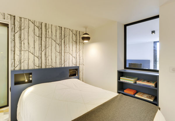 Côté déco, les architectes misent sur quelques touches de couleur. Un placage bleu mer est choisi pour la crédence du meuble TV, la niche du meuble d’entrée ainsi que pour la tête de lit. Le papier peint du salon est à dominante bleu, couvert de pastilles jaunes. Dans la chambre, dressée sur le porte-bagages, une paroi en verre teinté jaune réalisée par ABM Miroiterie (Toulouse) isole l’espace lit de l’espace penderie.