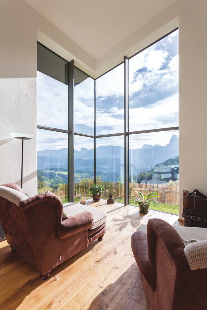Les angles tout vitrés. Vous souhaitez profiter pleinement de la vue sur le paysage alentour ? Et si l’angle de votre maison était vitré ? Ce type de menuiserie répond idéalement à la tendance actuelle, en neuf comme en rénovation, pour de généreuses surfaces vitrées. En exécution bord à bord, les surfaces vitrées sont placées les unes contre les autres. De cette manière, la continuité donnée par la surface vitrée n’est pas interrompue par le montant.